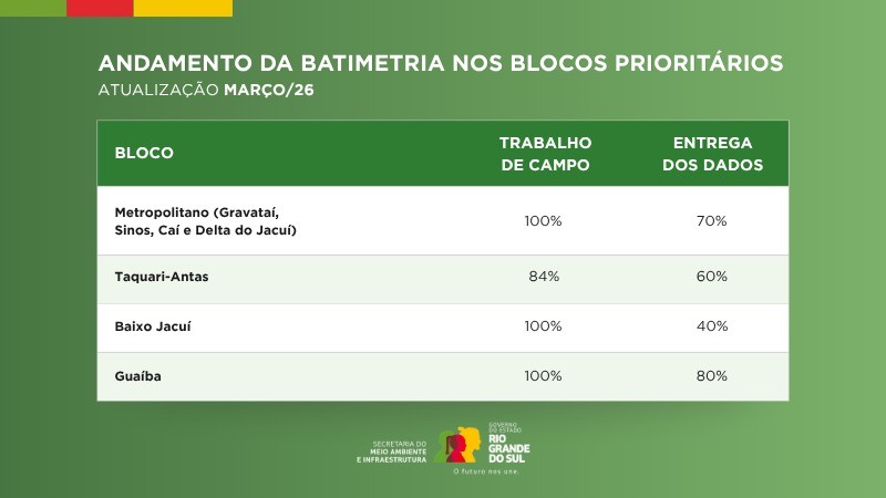 Os levantamentos abrangem os eixos Metropolitano (rios Gravataí, Sinos, Caí e Delta do Jacuí), Taquari-Antas, Baixo Jacuí, e Guaíba. A realização da batimetria integra o conjunto de ações do Eixo Diagnóstico do Plano Rio Grande. Liderado pelo governador Eduardo Leite, o Plano Rio Grande é um programa de Estado criado para proteger a população, reconstruir o Rio Grande do Sul e torná-lo ainda mais forte e resiliente, preparado para o futuro.
