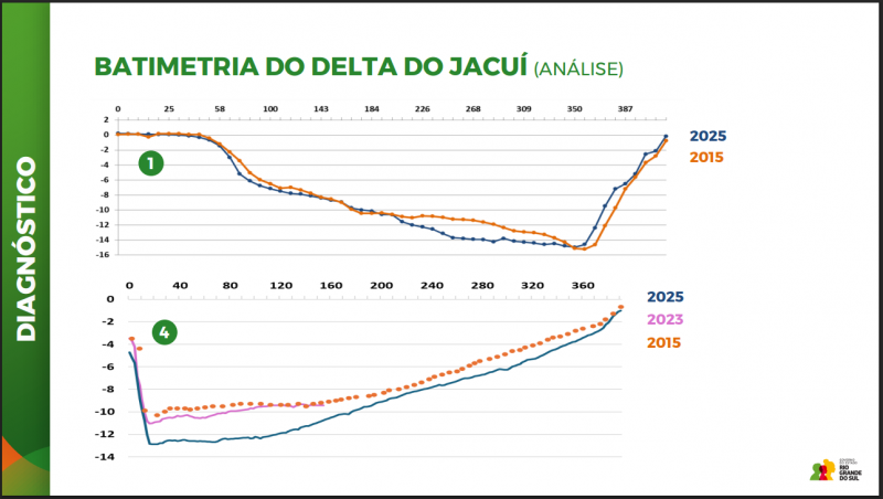 No Delta do Jacuí, a análise considerou o cruzamento de dados de levantamentos realizados em 2013, 2015 e no período de 2025/2026. Foram avaliadas mais de dez seções batimétricas, consolidadas em cinco pontos de controle. Os resultados apontam alta similaridade entre os levantamentos, indicando estabilidade no fundo do rio e ausência de processos relevantes de erosão ou assoreamento ao longo do período analisado.