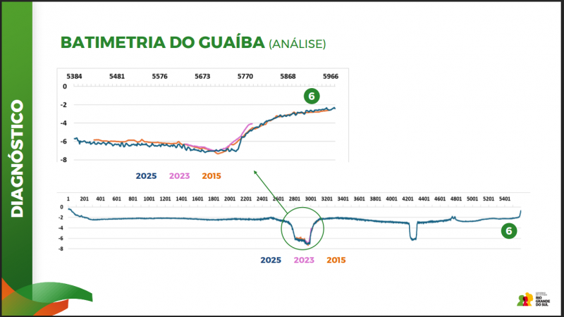No Lago Guaíba, a metodologia seguiu o mesmo padrão, com base na comparação entre séries históricas de 2013, 2015 e 2025/2026. A análise de seções batimétricas, consolidadas em dois pontos de controle, também não identificou alterações significativas no leito, reforçando a estabilidade observada.